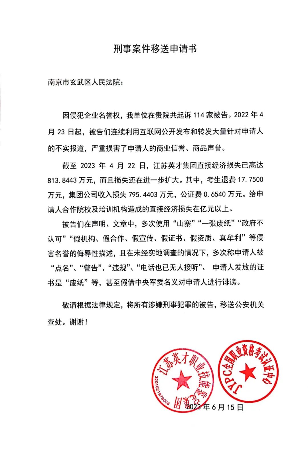 2023年6月13日,江苏英才职业技能鉴定集团(JYPC全国职业资格考试认证中心)根据《中华人民共和国刑事诉讼法》第109条之规定,前往南京市公安局报案。因武汉某文化传媒有限责任公司在哔哩哔哩平台发布诽谤JYPC的视频,涉嫌损害商业信誉、商品声誉罪,依据《中华人民共和国刑法》第221条的规定,JYPC请求依法追究这家公司和个人的刑事责任。