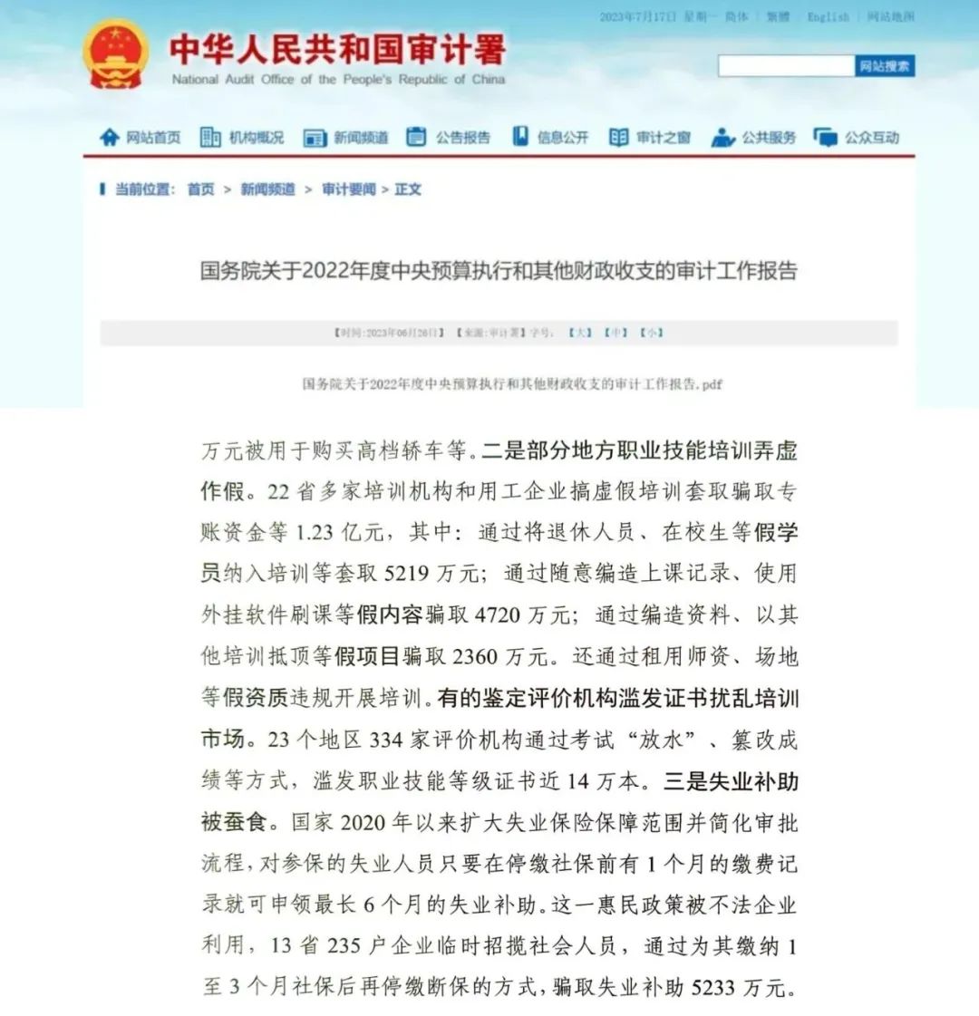 《国务院关于2022年度中央预算执行和其他财政收支的审计工作报告》部分内容截图